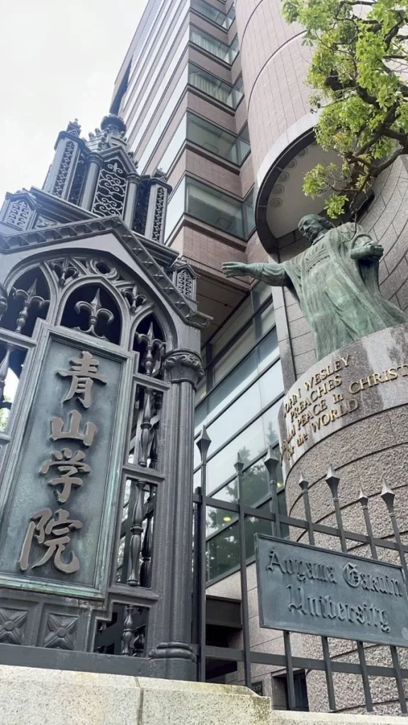 青山学院大学の校門にはジョン・ウェスレーの銅像が立つ