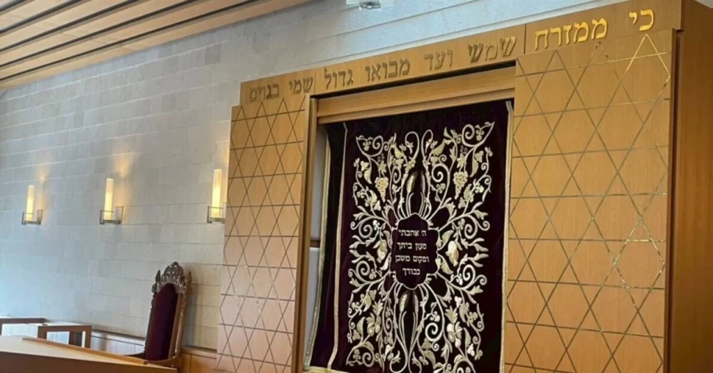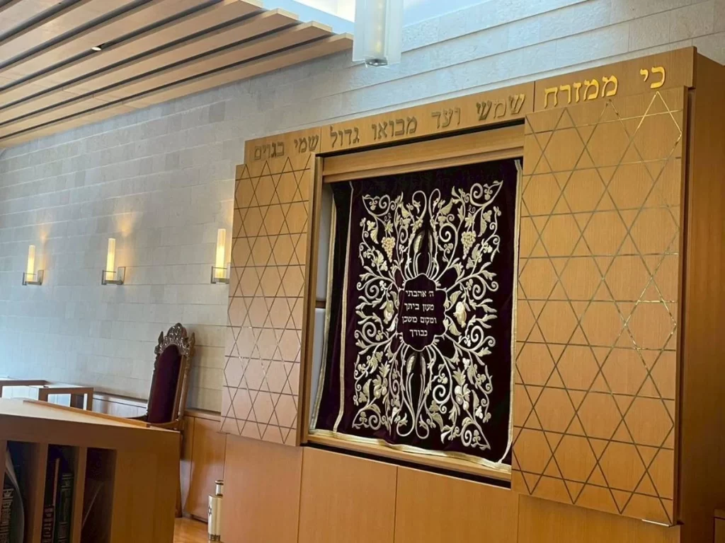 シナゴーグの内部の造りには一定の共通要素が見られ、聖櫃の中にはトーラーが収められています。トーラーを収める場所は、エルサレムにもっとも近い壁の中央です。聖櫃の手前、もしくはシナゴーグの中央に平らな机を置き、その上にトーラーの巻物を開いて置きます。机に面するか、あるいは囲うように信者の座席が用意されています。シナゴーグは、必ずエルサレムの方向を向いて座るように造られているのが特徴です。